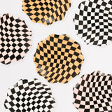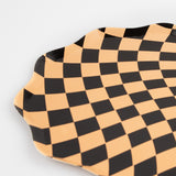 ¡Mira estos originales platos de papel de Halloween! La combinación de naranja, blanco y rosa, con un patrón de cuadros en espiral, le da un fabuloso aire psicodélico de los años 60. Estos platos de acompañamiento también son perfectos como platos de cóctel y combinarán de maravilla con tu vajilla de Halloween.