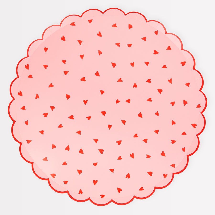 El rosa y el rojo son la combinación perfecta de colores románticos y de tendencia. En estos platos de papel, los hemos combinado con pequeños corazones y un borde festoneado para un fabuloso look vintage.