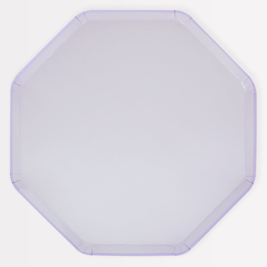 La forma octogonal de estos platos de papel, combinada con un color violeta por delante y por detrás, los convierte en una opción espectacular para tu fiesta o cena especial. Son perfectos para un baby shower, una fiesta de cumpleaños o cualquier celebración que busque una paleta de colores relajante. Los platos forman parte de nuestra nueva y elegante versión de vajilla combinable.